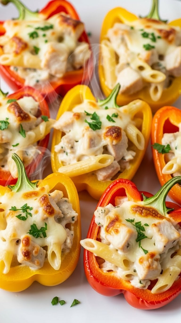 - In a bowl, mix pasta, Alfredo sauce, and chicken; fill each pepper with the mixture.
