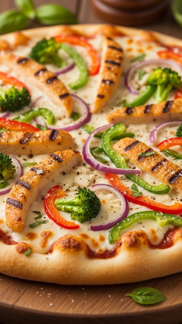- Spread Alfredo sauce over the crust, then layer with chicken, veggies, and cheese.