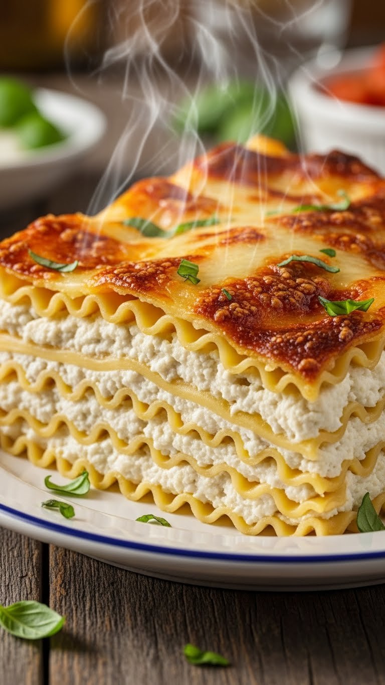 - Cook lasagna noodles and layer in a baking dish with ricotta mixed with egg, Alfredo sauce, and mozzarella.