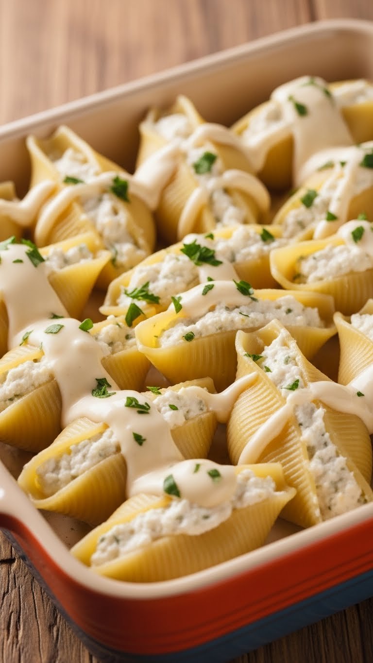 - Fill each shell with ricotta, place in a baking dish, and pour Alfredo sauce over them. Top with mozzarella and Parmesan.