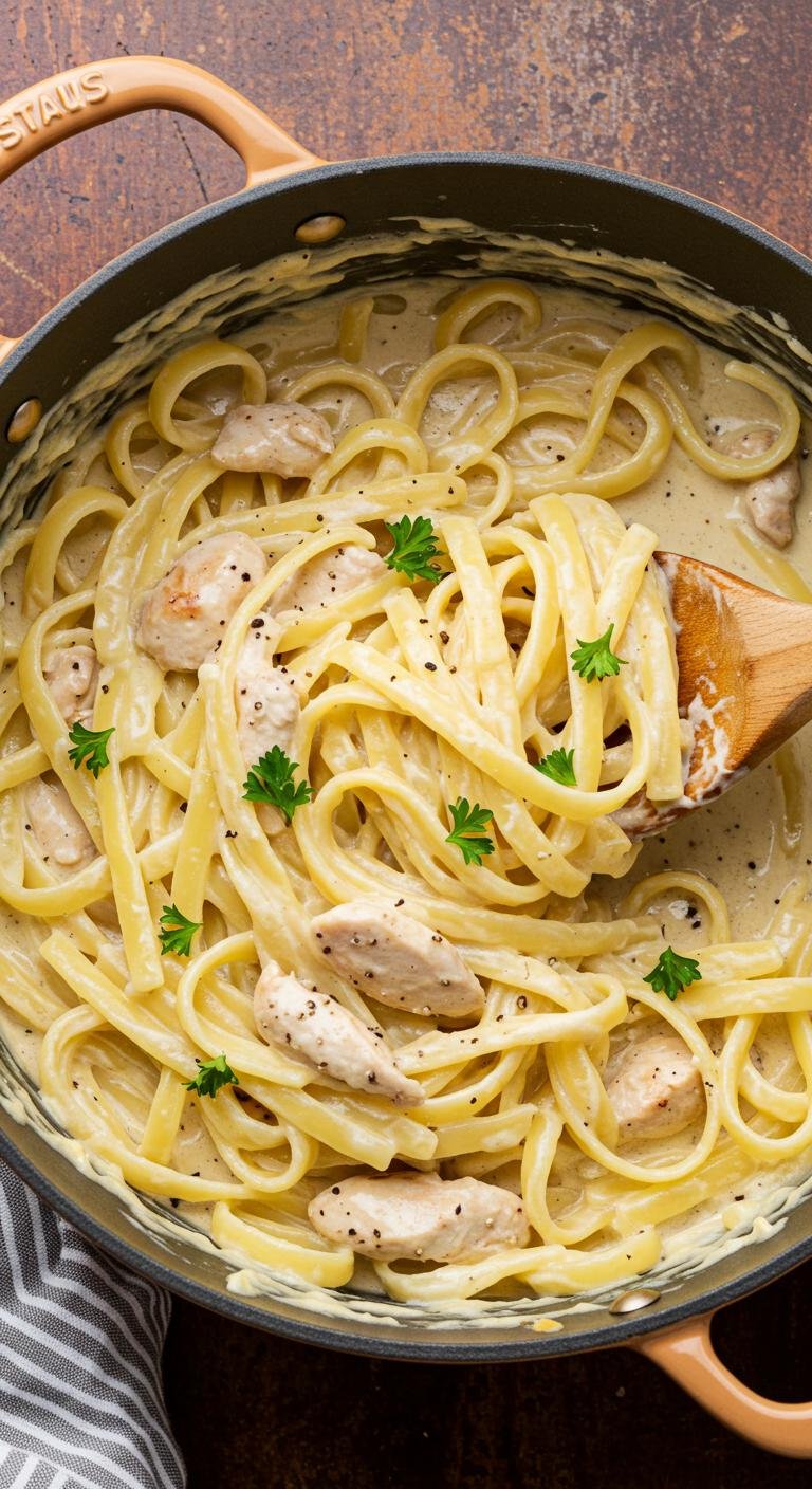 - Add fettuccine, cream, Parmesan, salt, and pepper. Stir and cook until pasta is tender and sauce thickens.
