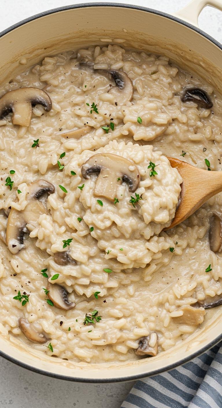 - Add arborio rice and stir, then pour in wine. Slowly add broth, stirring until absorbed.