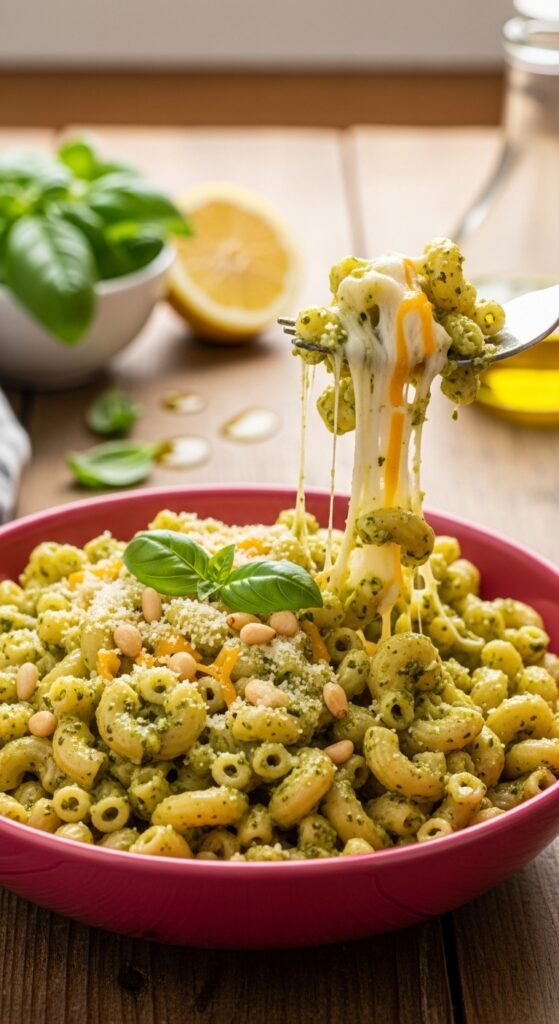 - In a saucepan, mix milk, mozzarella, and pesto until melted.