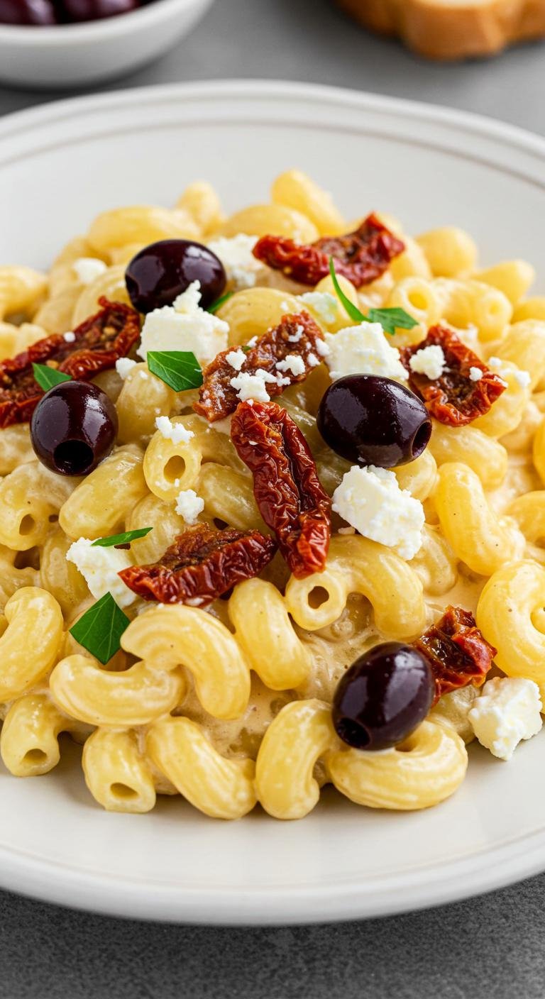 - Mix together milk, sun-dried tomatoes, and olives, heating until warm.
