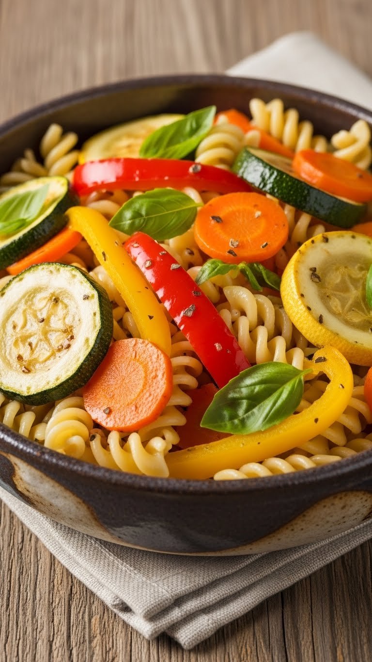 - Toss pasta with roasted veggies, olive oil, balsamic vinegar, salt, and pepper.