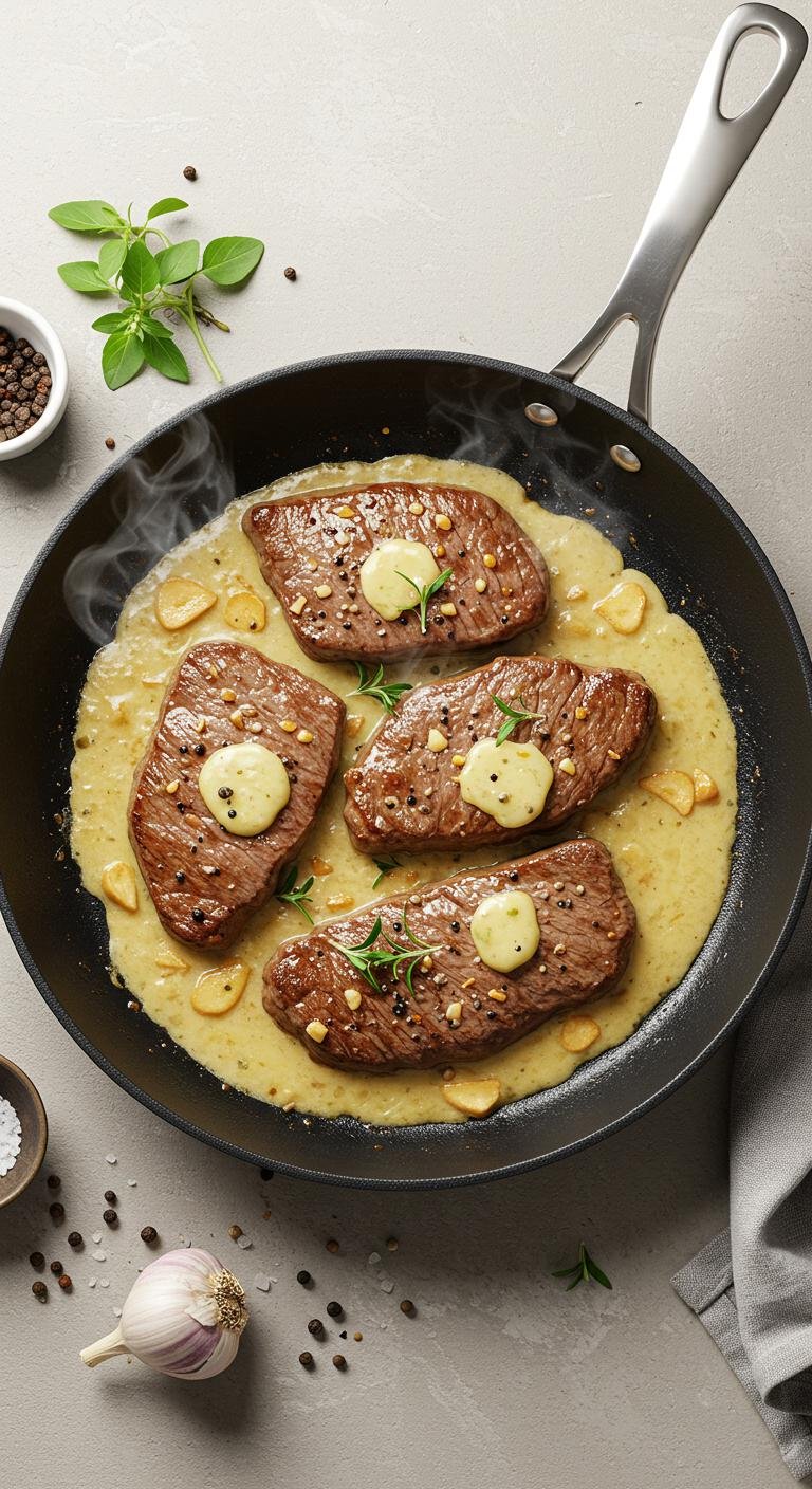 - Cook steak in a skillet until browned, melt in butter and garlic.