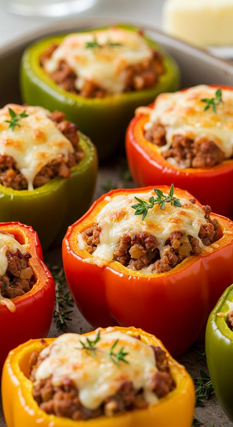 - Stuff halved peppers and bake at 375°F for 30 minutes. Top with cheese and broil until melted.