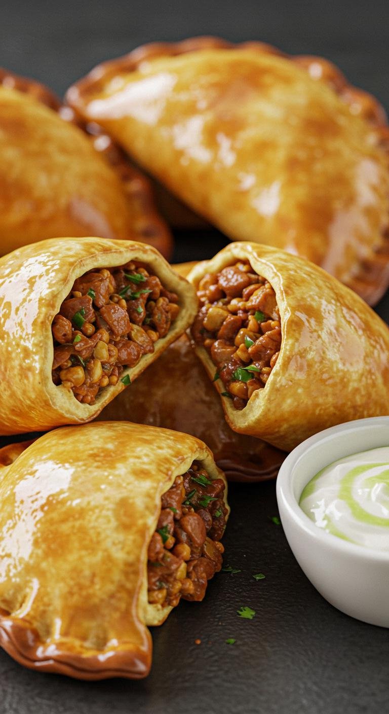 - Fill empanada dough with meat mixture, seal, brush with egg, and bake until golden.