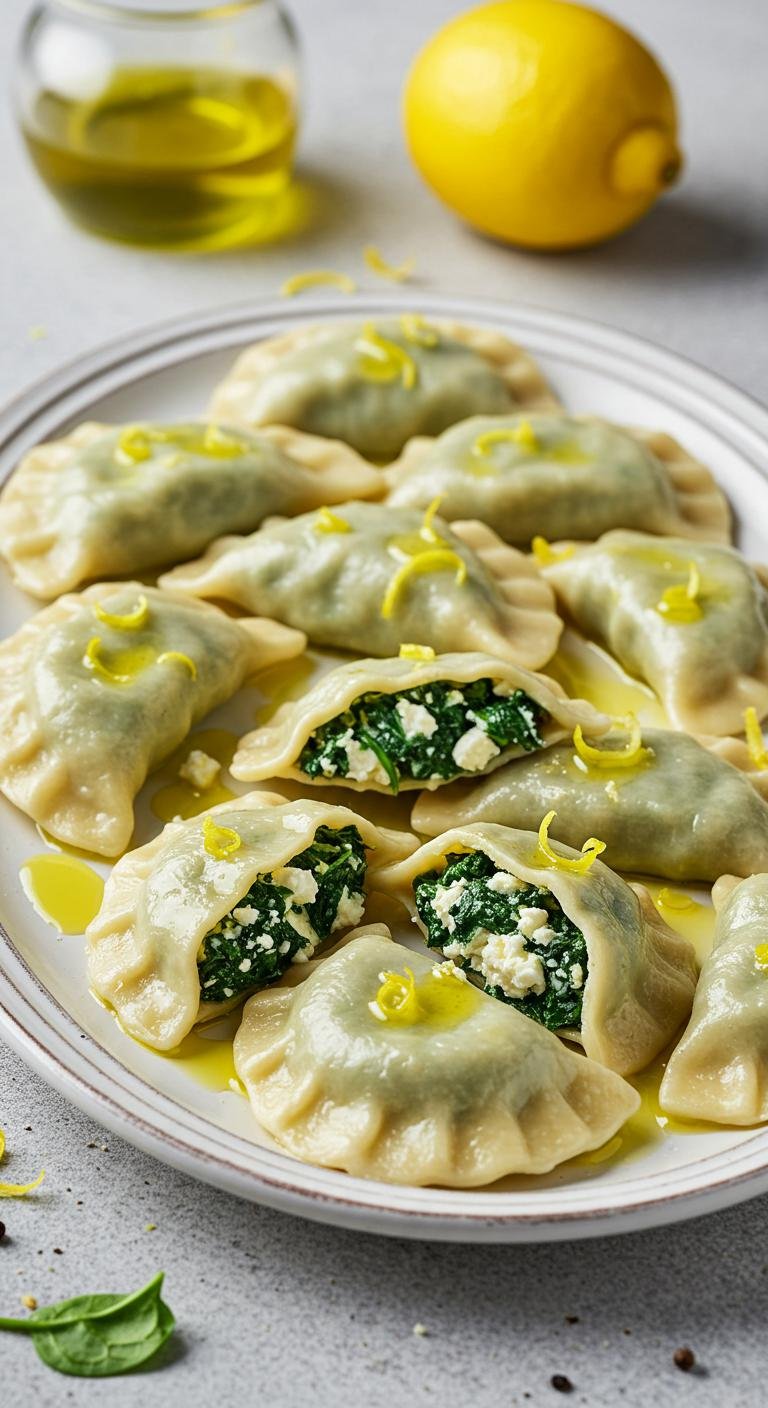 - Fill dough with spinach-feta mixture, seal, and boil.
