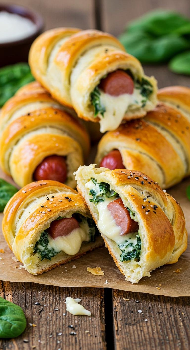 - Roll out dough, place a small amount of the spinach mixture, then wrap the frank in dough.