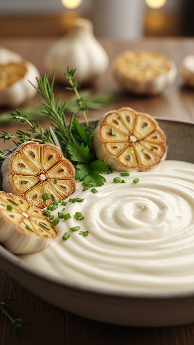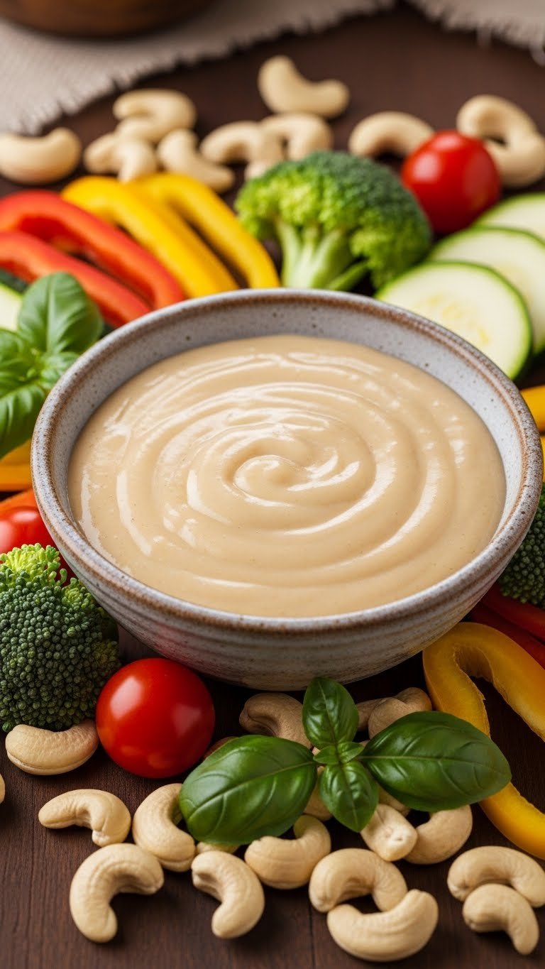 - Blend soaked cashews, water, lemon juice, and garlic powder until smooth.