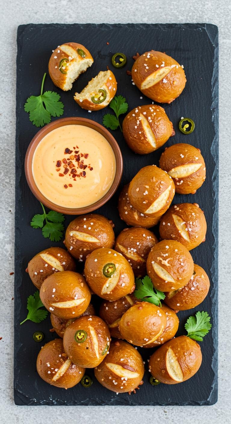 - Fold cheddar and jalapeños into pretzel dough and shape into small bites.