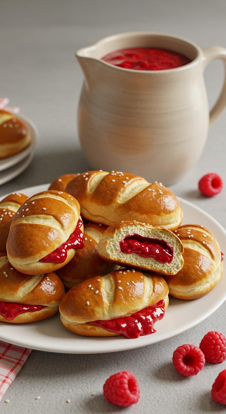 - Stuff small balls of pretzel dough with raspberry jam and shape.