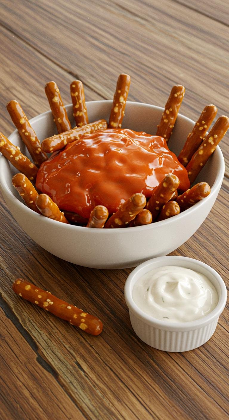 - Bake pretzel sticks until golden, then toss in buffalo sauce.