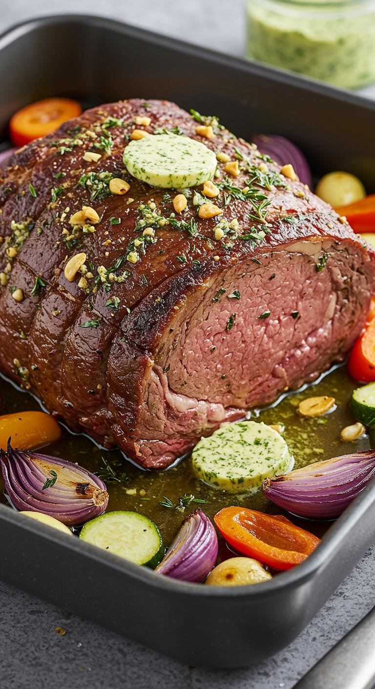 - Brush the roast with garlic butter, sprinkle with herbs, salt, and pepper.