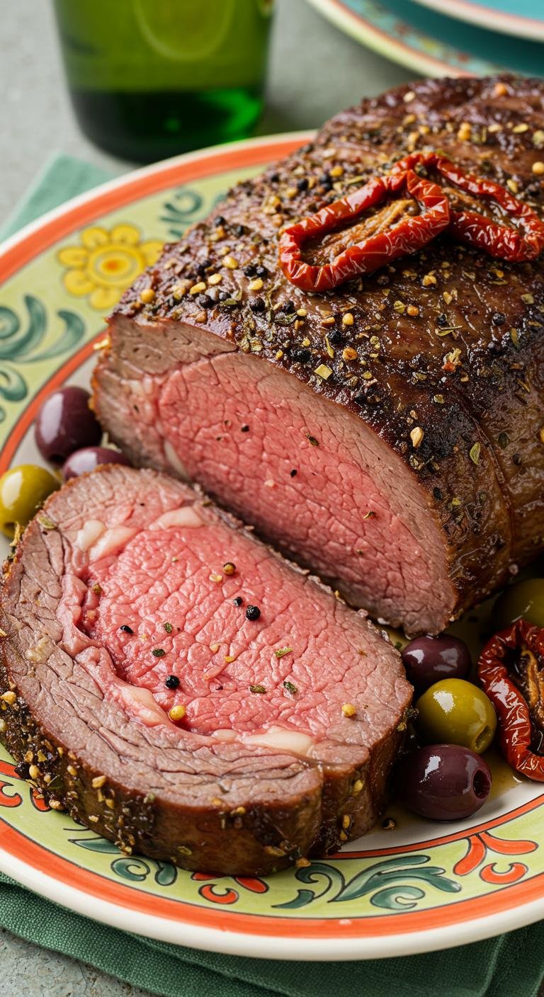 - Rub the roast with olive oil, garlic, herbs, salt, and pepper.