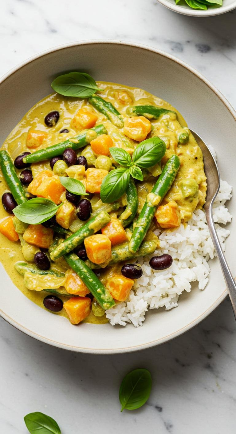 - In another pan, stir-fry mixed vegetables and add curry paste and black beans.