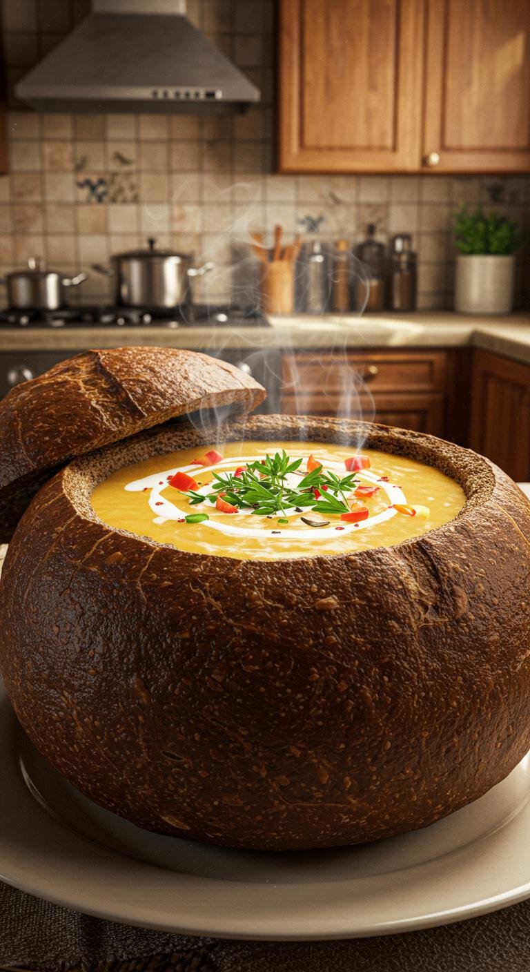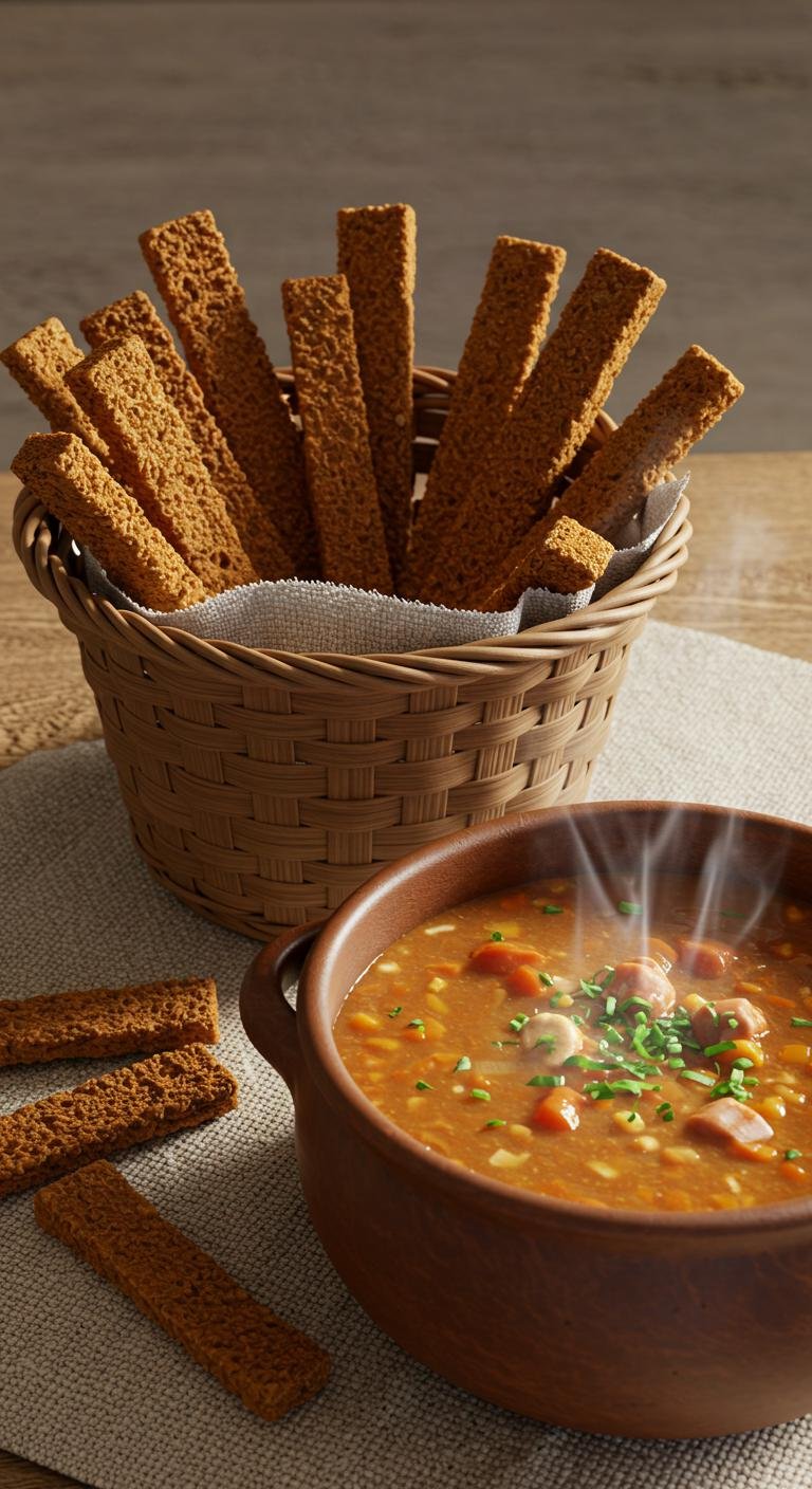 - Pour into a bowl and arrange rye bread strips around the edge for dipping.