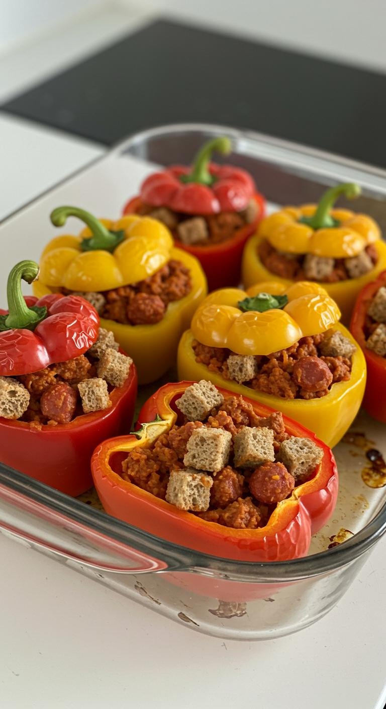 - Stuff the mixture into each pepper half, top with cheese, and bake for 25-30 minutes.