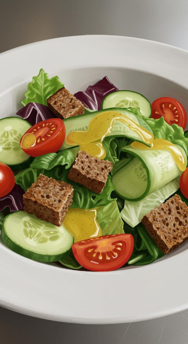 - In a large bowl, combine mixed greens, tomatoes, and cucumber.