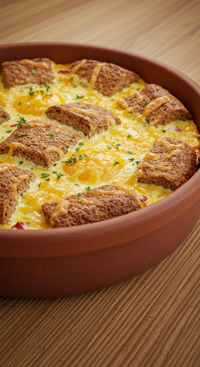 - Whisk eggs and milk together, then add cubed bread, cheese, salt, and pepper.