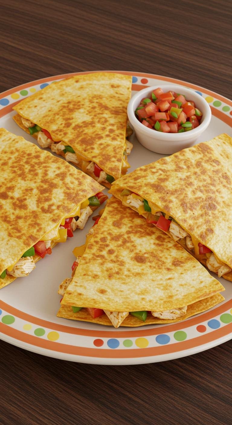 - Layer cheese, chicken, and peppers on top, then add another tortilla.