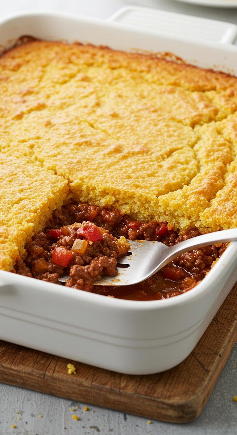- Pour into casserole dish, top with cornbread batter and cheese.