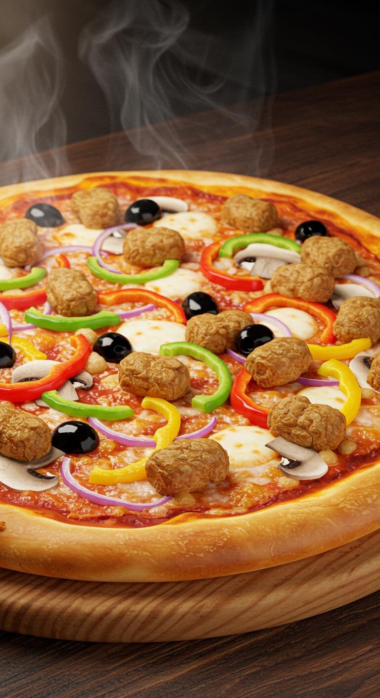 - Spread pizza sauce on crust; top with soya chunks, veggies, and cheese.
