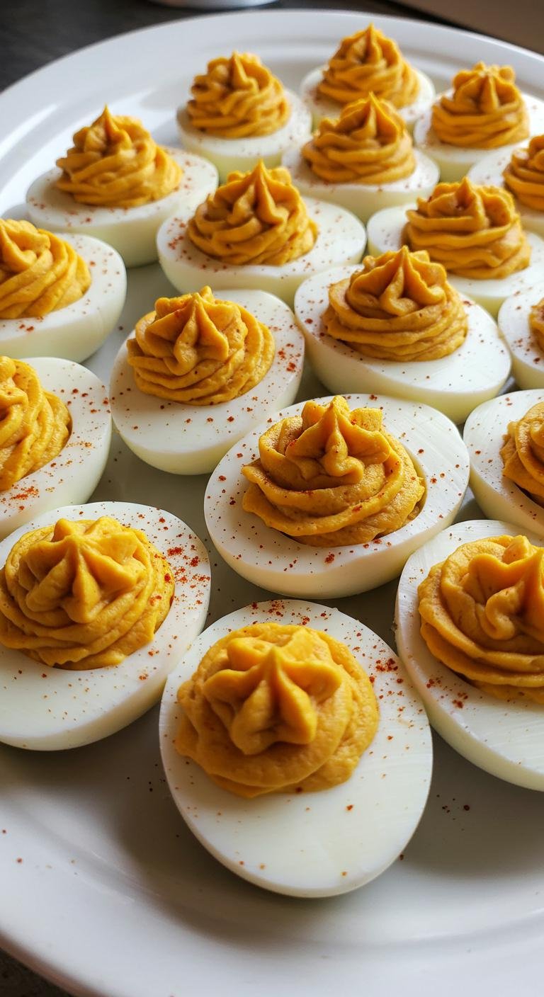 - Mash yolks with spicy mayo, salt, and pepper. Fill egg whites with the mixture.