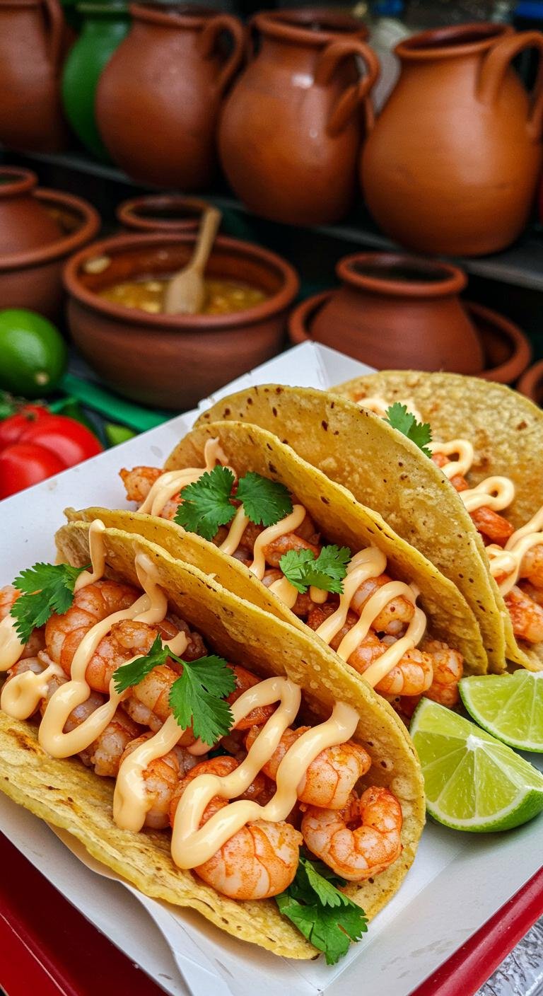 - Assemble tacos with shrimp, lettuce, and a drizzle of spicy mayo.