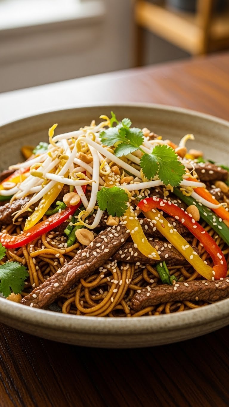 - Mix cooked noodles, peppers, and bean sprouts in a bowl.