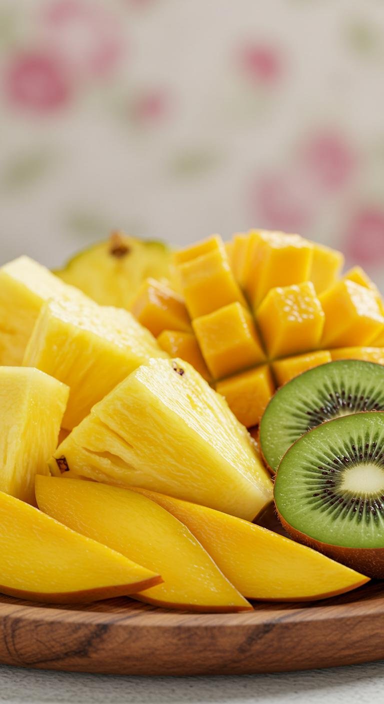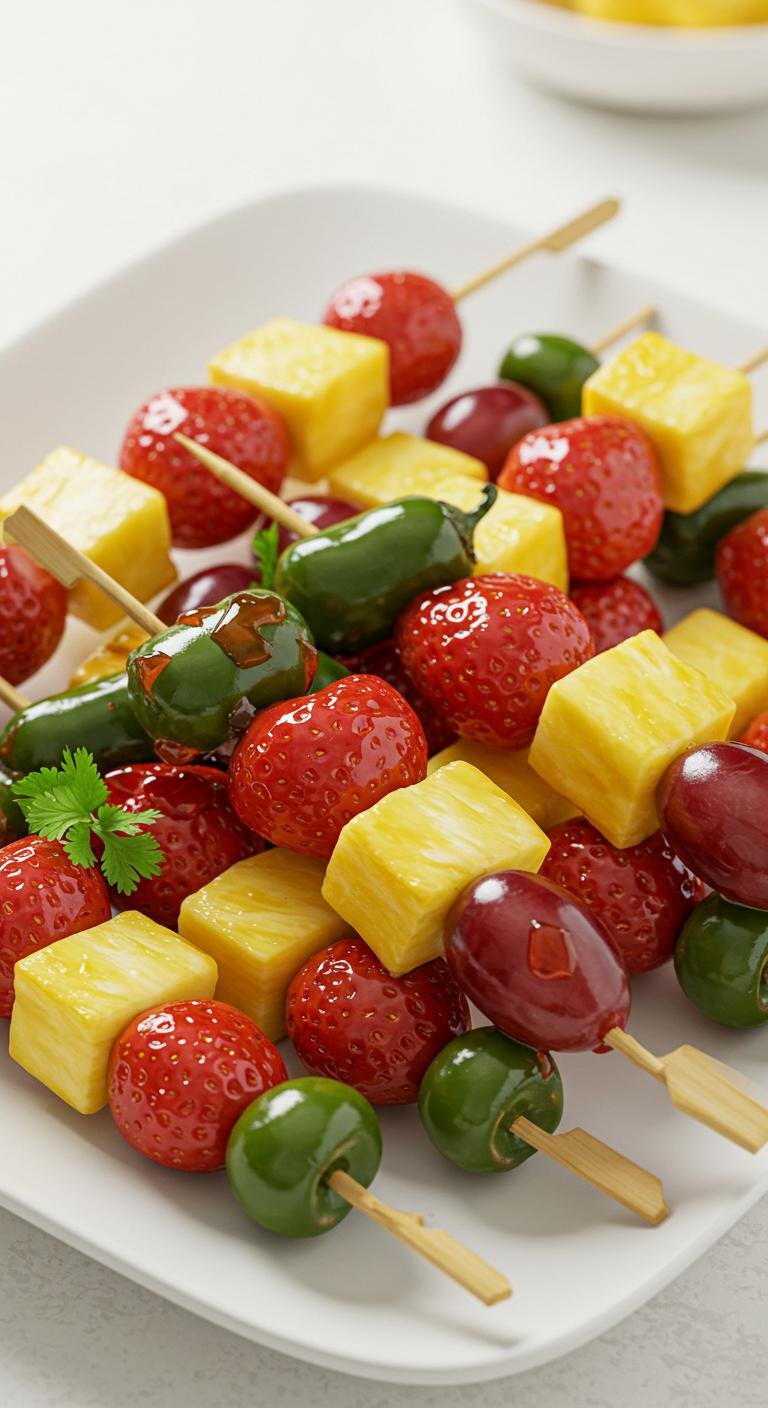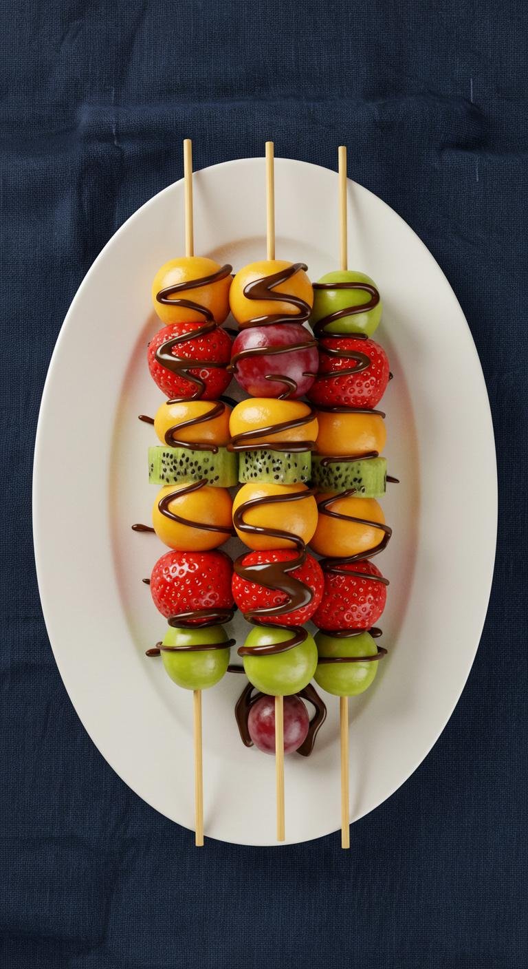 - Prepare skewers with chunks of pineapple, mango, and kiwi.