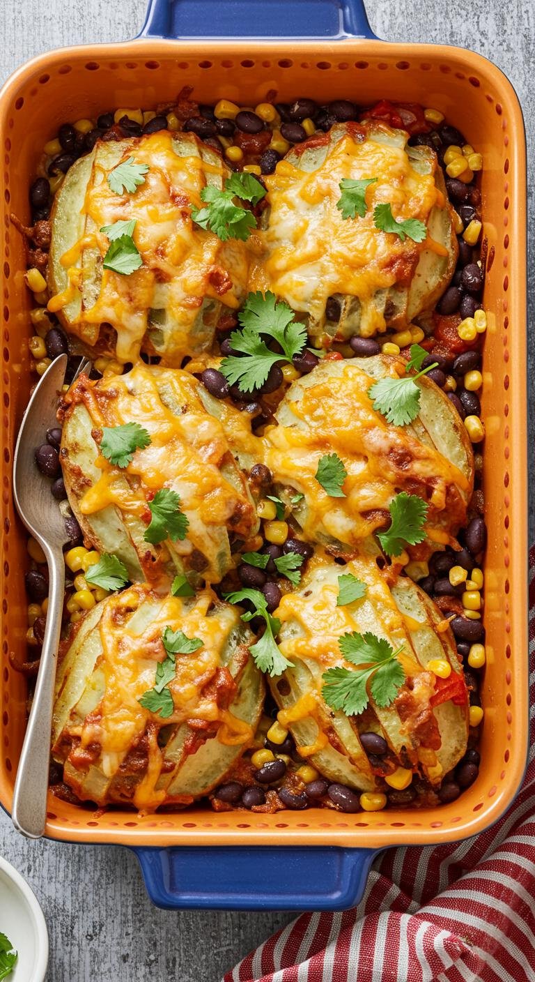 - Bake potatoes, scoop, and mix with beans, corn, bell pepper, cumin, and cheese.