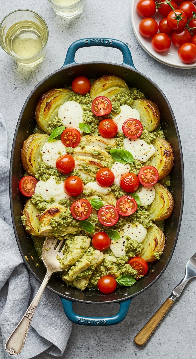 - Bake potatoes, scoop out the inside, and mix with chicken and pesto.