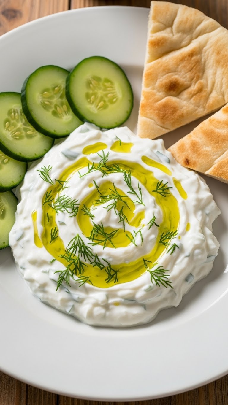 - In a bowl, mix the yogurt, grated cucumber, garlic, olive oil, and dill until well combined.