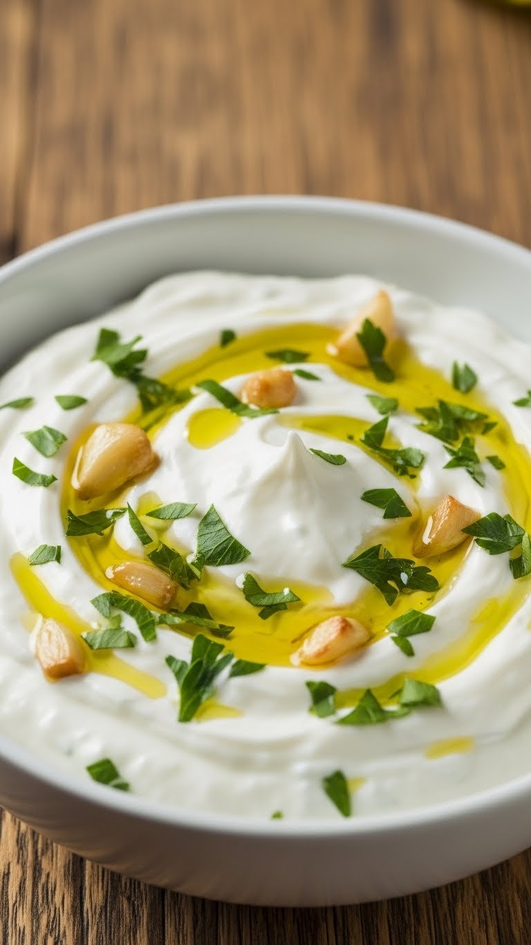 - In a mixing bowl, combine yogurt, feta cheese, olives, and garlic.