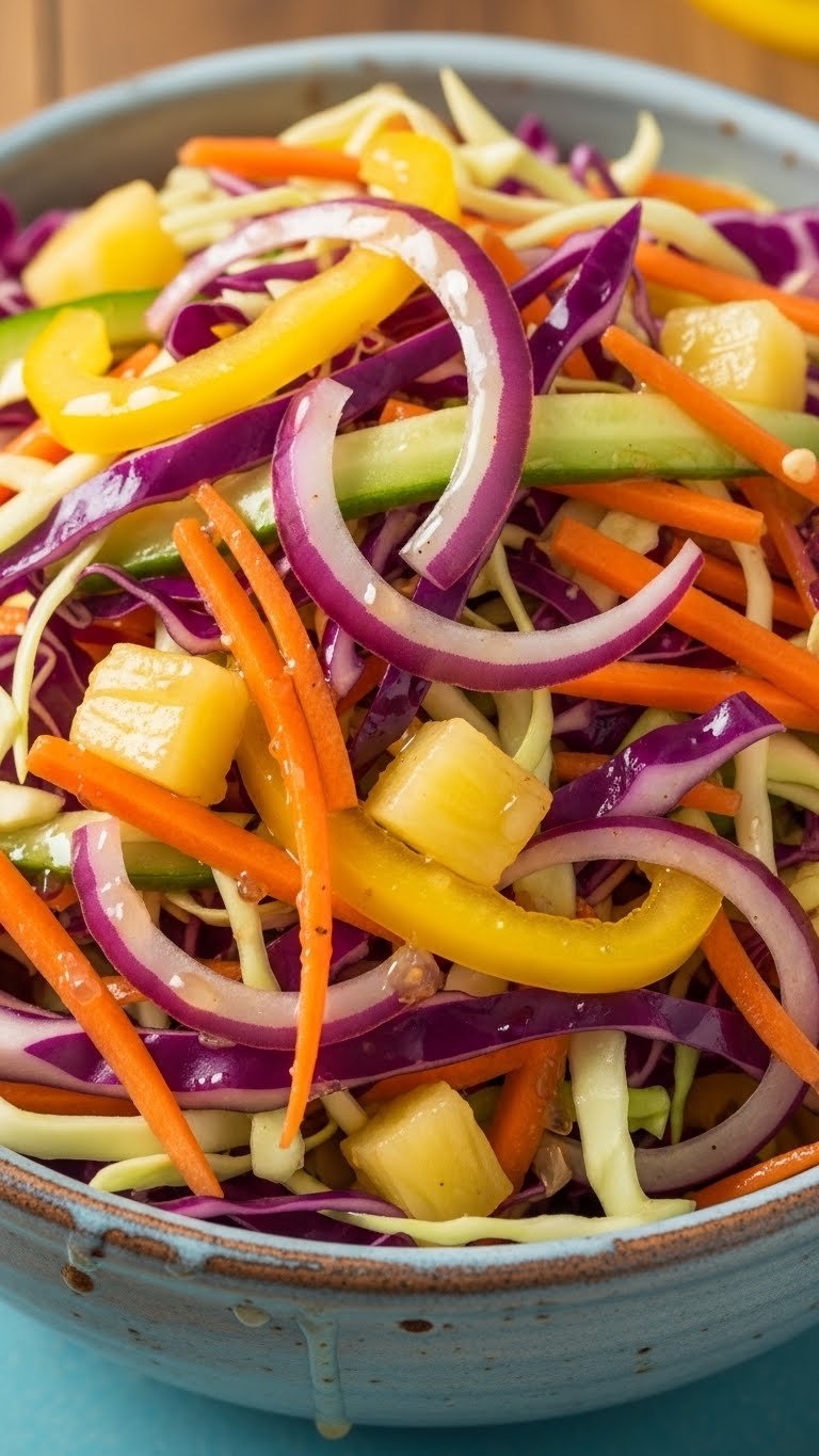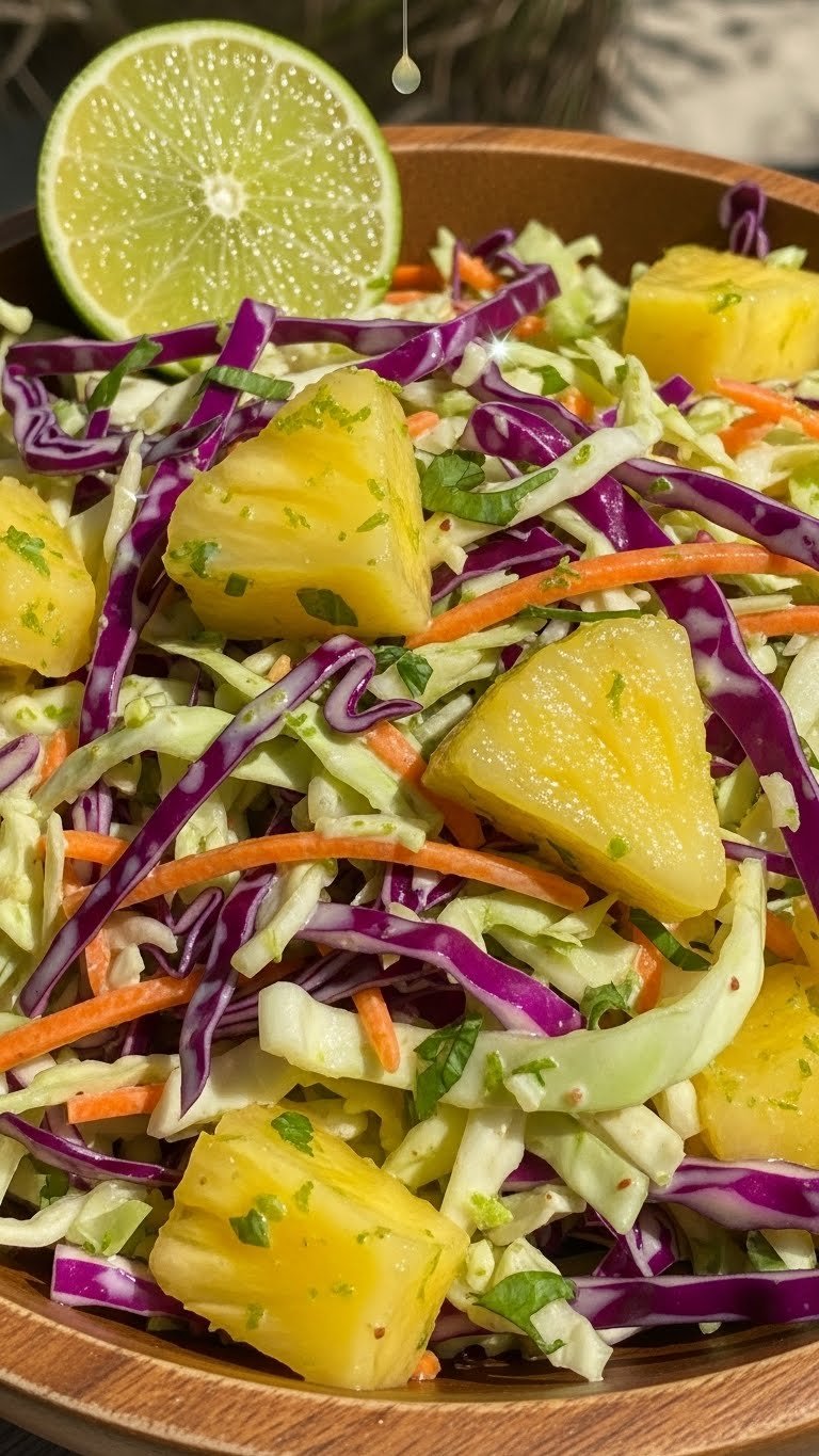 - In a bowl, combine cabbage, carrots, and pineapple.