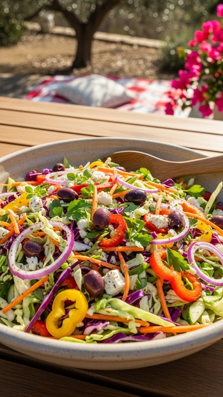 - Combine cabbage, bell pepper, olives, and feta in a bowl.