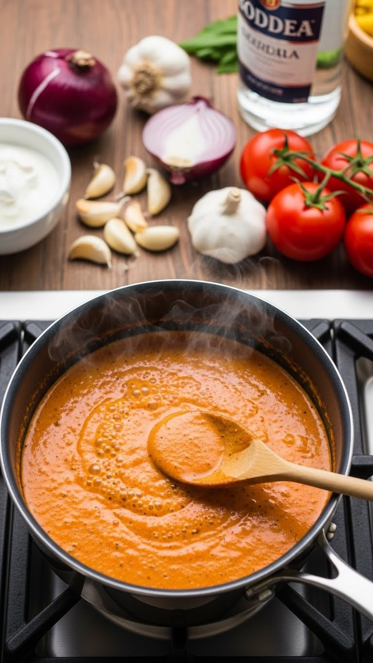 - Add crushed tomatoes and vodka, simmer for 10 minutes.