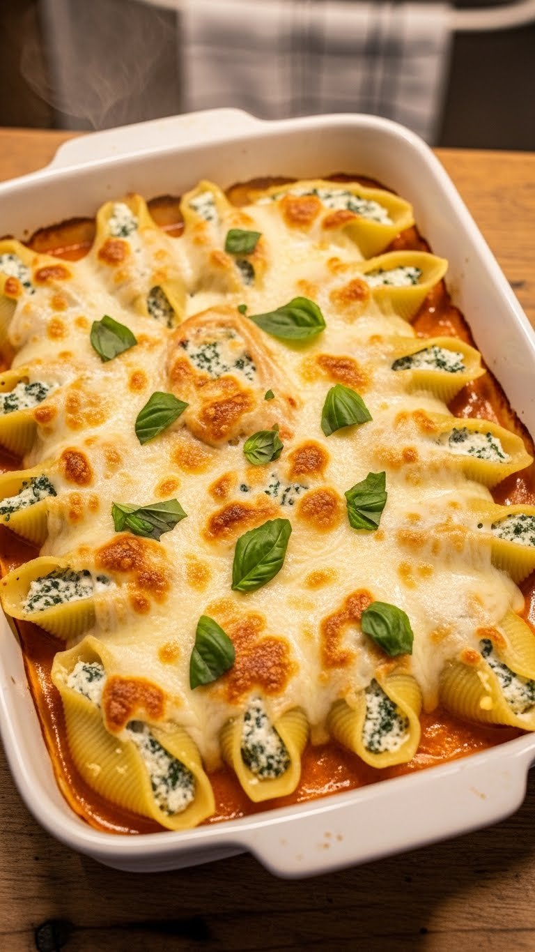 - Mix ricotta with salt, pepper, and mozzarella, then stuff shells.