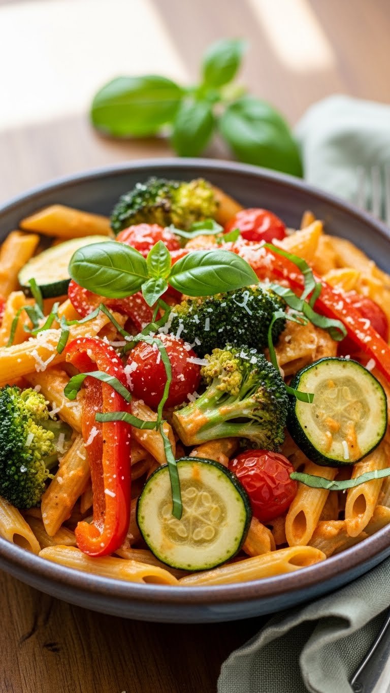 - Cook penne; drain and mix with roasted vegetables and vodka sauce.